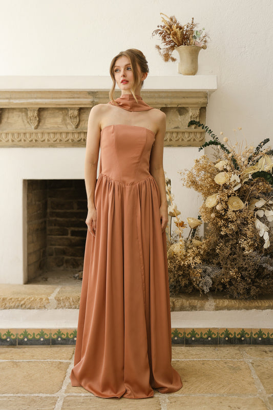 SELENA Strapless Flowy Maxi with Sash Neckpiece (Brown Charmeuse Silk)