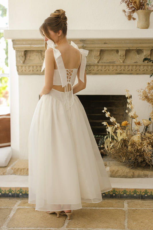 DOMIKA Sleeveless Bow Midi Dress with Drop Waist Shirred Skirt (Ivory White Matte Organdy)