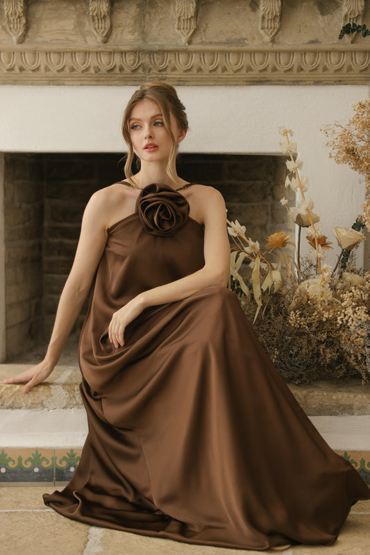 FLORA Flowy Maxi with Floral Detail on Neckline (Brown Crepe Charmeuse Silk)