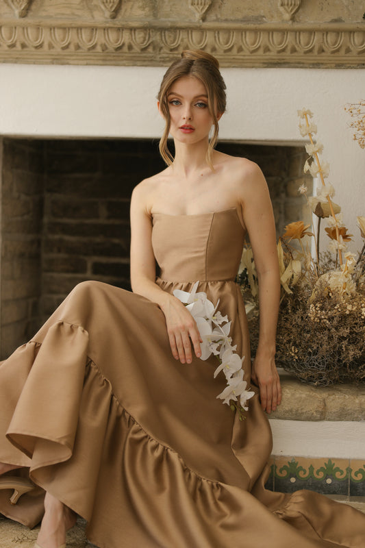 MADELEINE Strapless High Low Gown with Ruffle Hem (Khaki Gazaar)