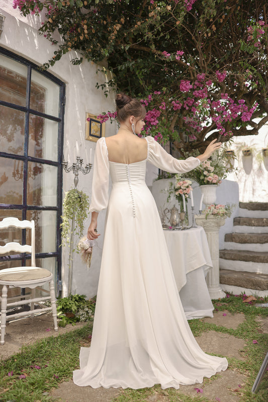 SIENNA Full Sleeve Chiffon Maxi Dress with Trail and Covered Button Back Detail (White Chiffon) SAME DAY DELIVERY - SMALL