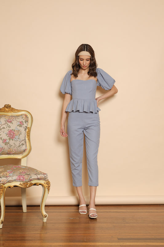 CLARA PANTS SET Peplum Puff Sleeve Blouse (Serenity Blue Linen)