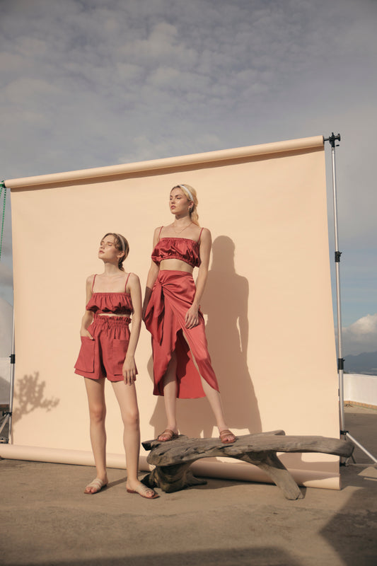 CRETE SET Two Piece Paperbag Trouser Shorts with Front Pockets and Gathered Crop Top (Rust Linen)