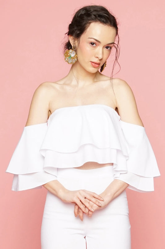 EMILIA PANTS SET: Layered Off Shoulder Top + Straight Cut Trouser (White)