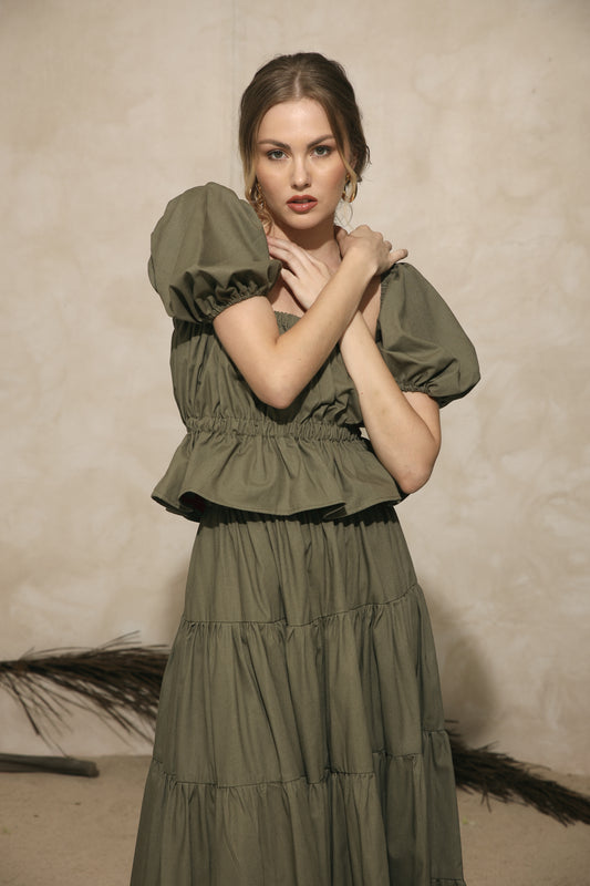 ALBA SET Balloon Sleeve Gartered Top with Four-Layer Midi Skirt (Olive Linen)