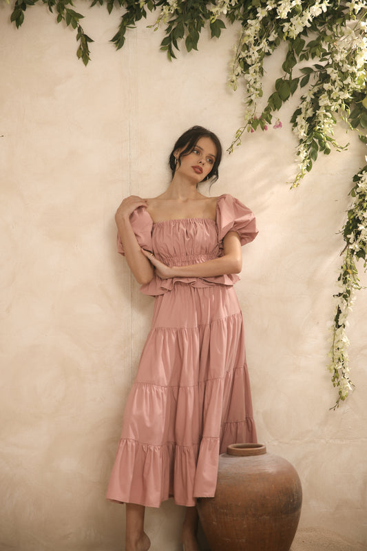 ALBA SET Balloon Sleeve Gartered Top with Four-Layer Midi Skirt (Pink Linen)