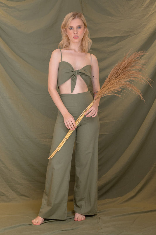 FIJI PANTS SET Tie Front Crop Top and High Waist Culottes (Olive Linen)