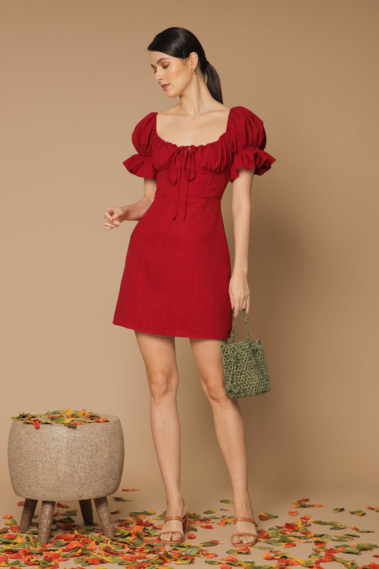 FIA Puff Sleeve Mini Dress with Frill and Drawstring Detail (Maroon Linen)