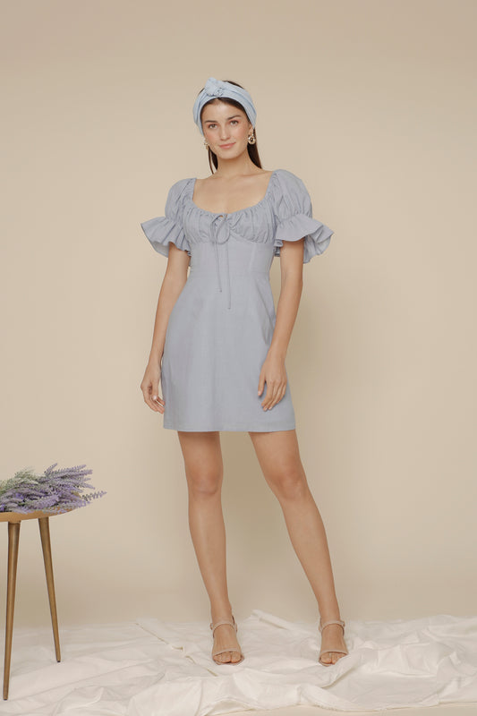 FIA Puff Sleeve Mini Dress with Frill and Drawstring Detail (Serenity Blue Linen)
