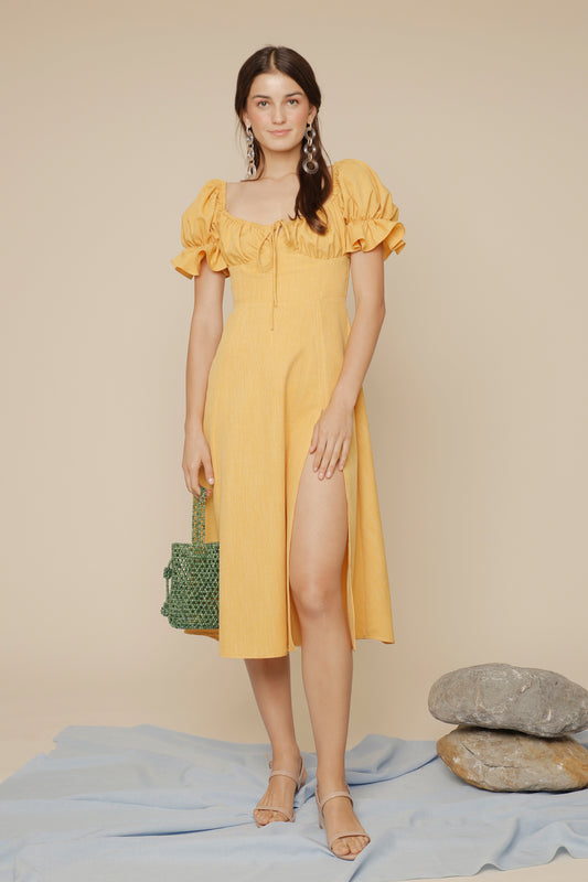 FERNANDA Puff Sleeve Midi Dress with Frill and Drawstring Detail and High Slit (Yellow Chambray)
