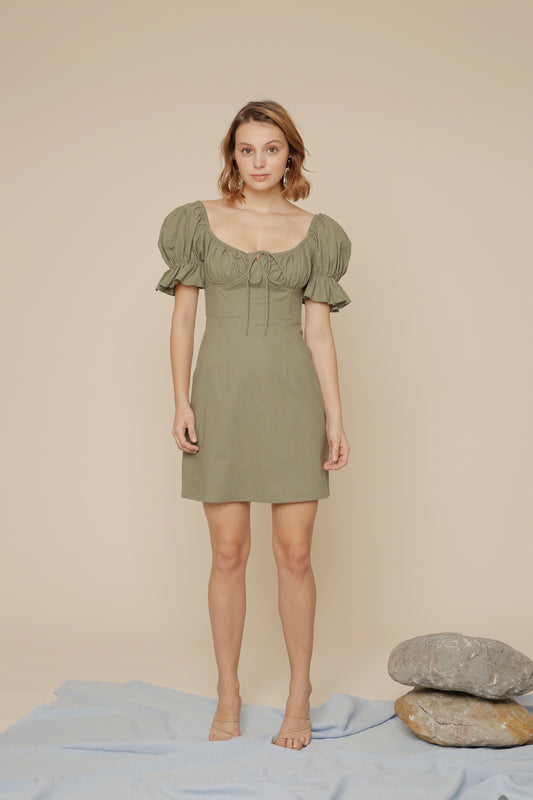 FIA Puff Sleeve Mini Dress with Frill and Drawstring Detail (Olive Linen)