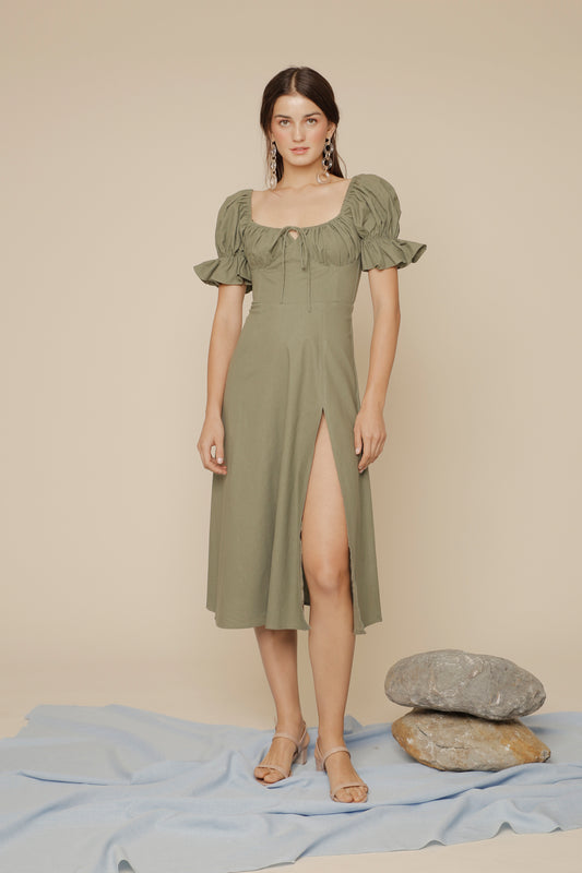 FERNANDA Puff Sleeve Midi Dress with Frill and Drawstring Detail and High Slit (Olive Linen)