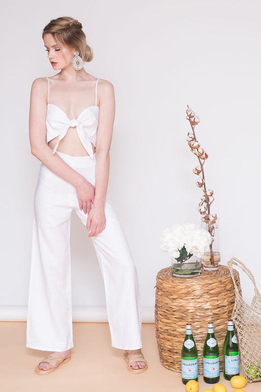 FIJI PANTS SET Tie Front Crop Top + Culottes (White Linen)