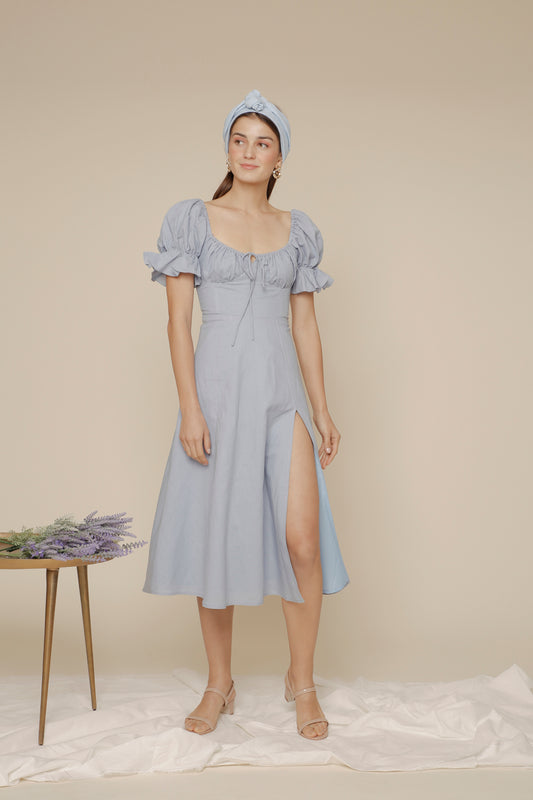 FERNANDA Puff Sleeve Midi Dress with Frill and Drawstring Detail and High Slit (Serenity Blue Linen)