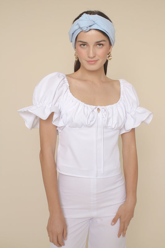 FLOR TOP Puff Sleeve Top with Frill and Drawstring Detail (White Linen)