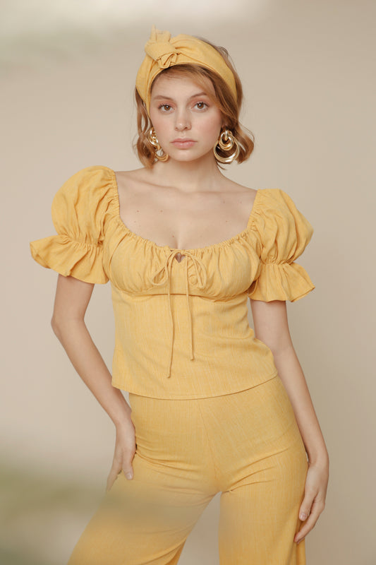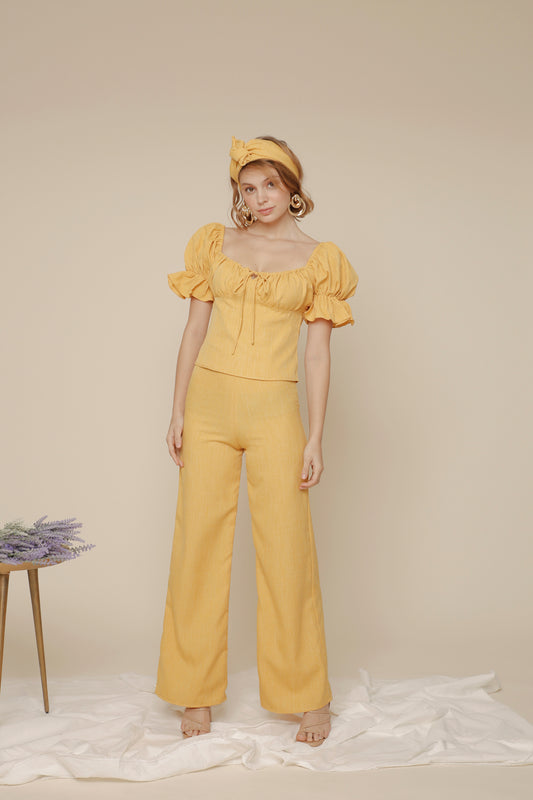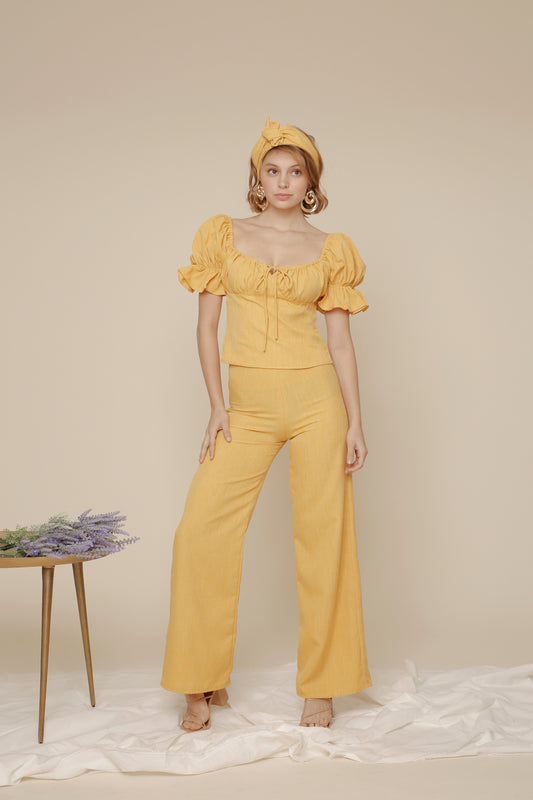 FLOR PANTS SET Puff Sleeve Top with Frill and Drawstring Detail and High Waist Culottes (Yellow Chambray)