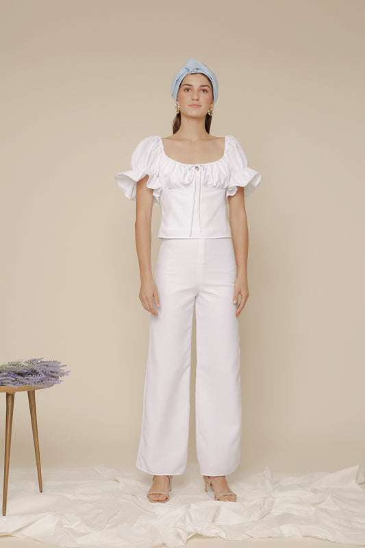 FLOR PANTS SET Puff Sleeve Top with Frill and Drawstring Detail and High Waist Culottes (White Linen)