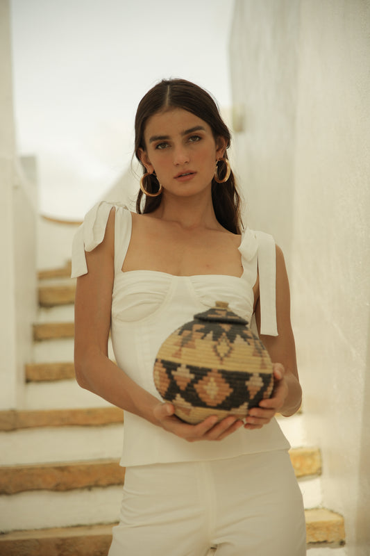FLEUR TOP Tie on Shoulder Top with Gathered Cup (White Linen)