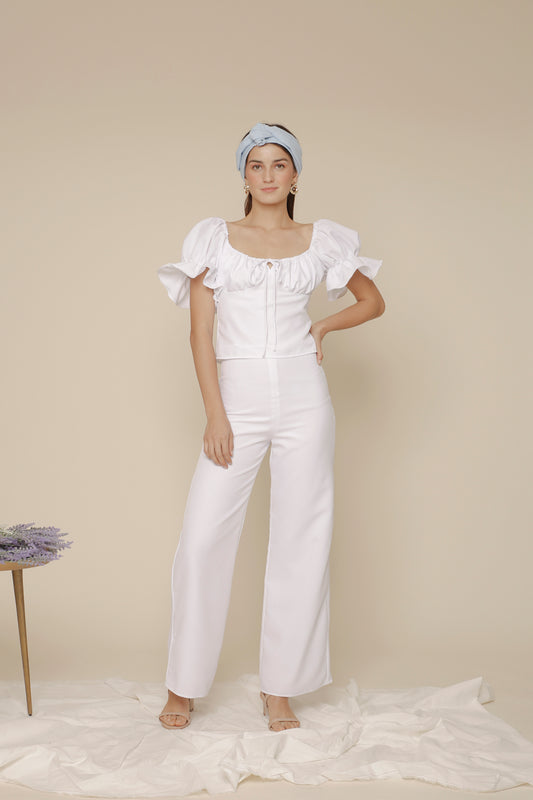 FLEUR PANTS SET Tie on Shoulder Top with Gathered Cup and Slim Trouser Pant (White Linen)