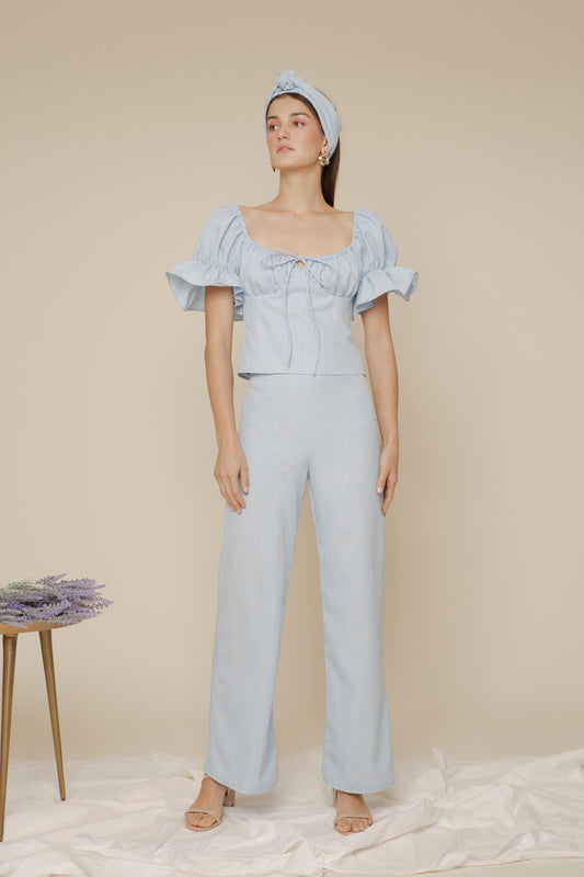 FLOR PANTS SET Puff Sleeve Top with Frill and Drawstring Detail and High Waist Culottes (Light Blue Chambray)