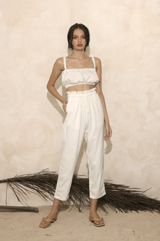 AMORA PANT SET Gathered Crop Top and Gartered Pant (White Silk)