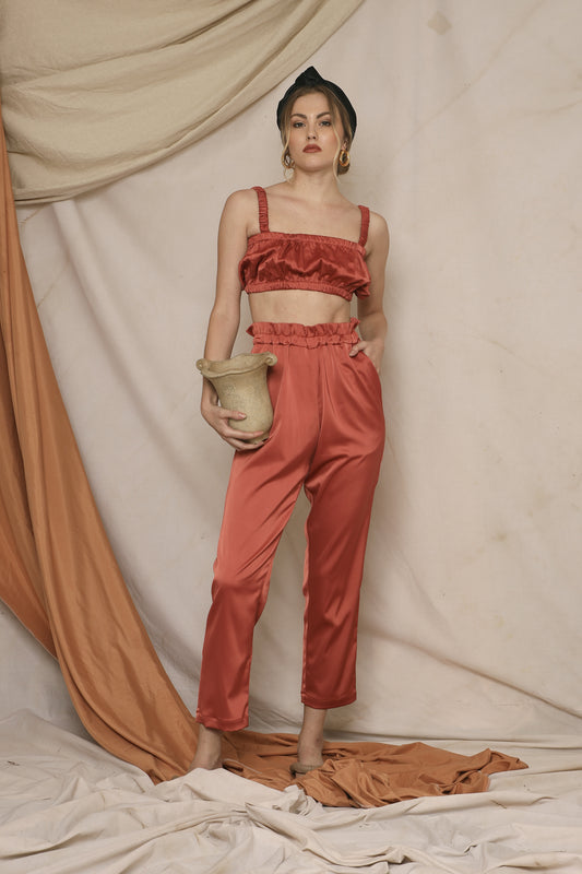 AMORA PANT SET Gathered Crop Top and Gartered Pant (Rust Silk)