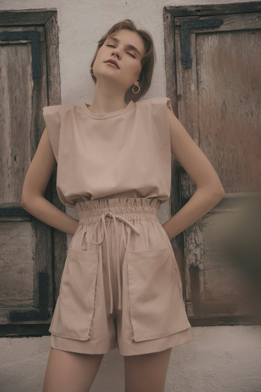 LYON SET Two Piece Paperbag Trouser Shorts with Front Pockets and Padded Sleeve Top (Nude Linen)