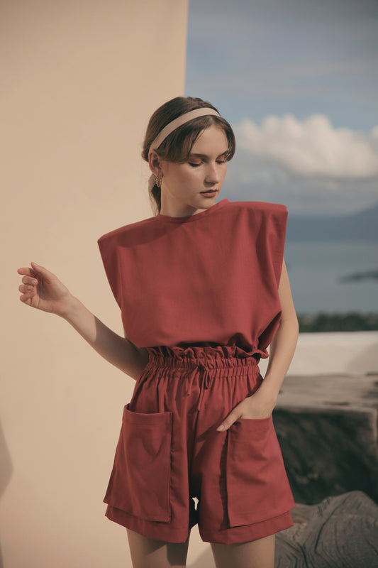 LYON SET Two Piece Paperbag Trouser Shorts with Front Pockets and Padded Sleeve Top (Rust Linen)