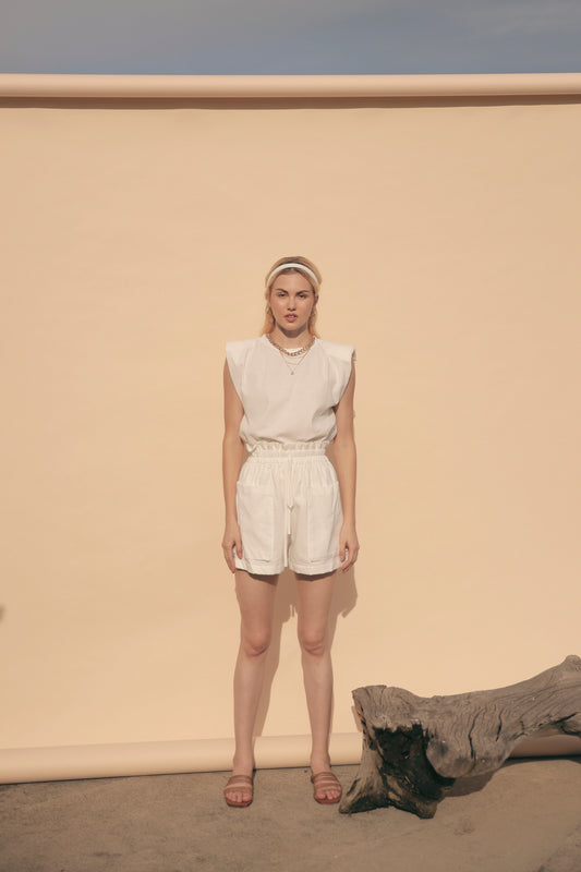 LYON SET Two Piece Paperbag Trouser Shorts with Front Pockets and Padded Sleeve Top (White Linen)