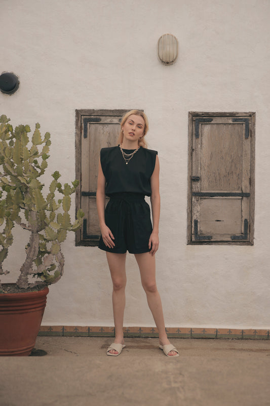 LYON SET Two Piece Paperbag Trouser Shorts with Front Pockets and Padded Sleeve Top (Black Linen)