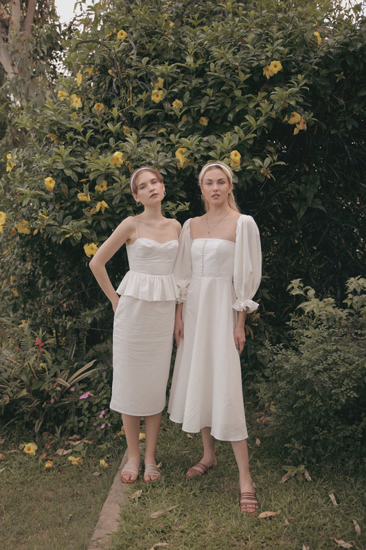 MARBELLA Sweetheart Cut Neckline Midi Dress with Peplum Detail (White Linen)