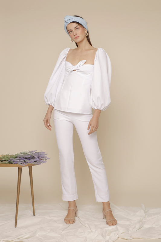 MARI SET Puff Sleeve Blouse with Tie and High Waist Slim Trouser (White Linen)