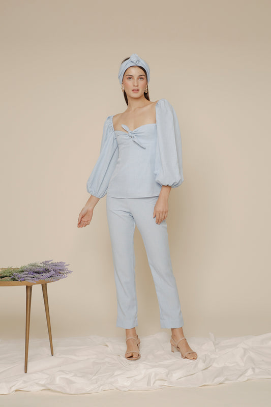 MARI SET Puff Sleeve Blouse with Tie and High Waist Slim Trouser (Light Blue Chambray)