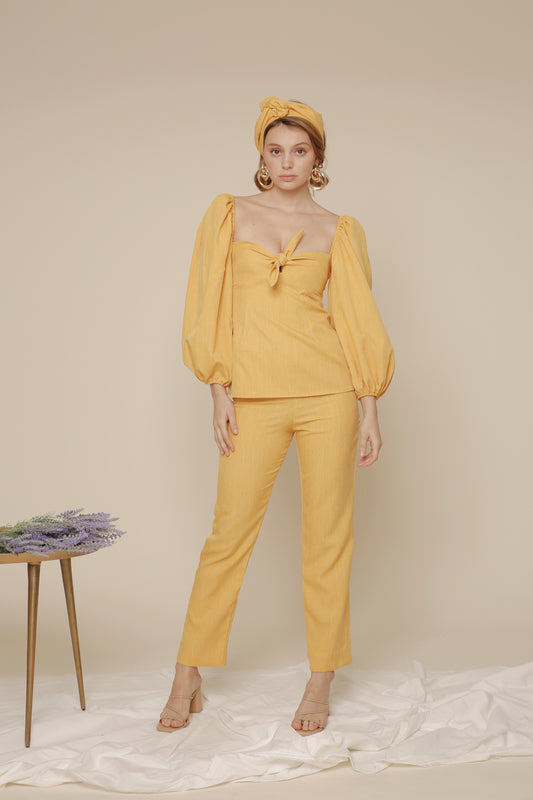 MARI SET Puff Sleeve Blouse with Tie and High Waist Slim Trouser (Yellow Chambray)