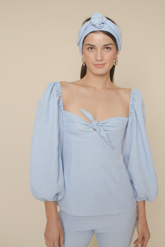 MARI TOP Puff Sleeve Blouse with Tie (Light Blue Chambray)