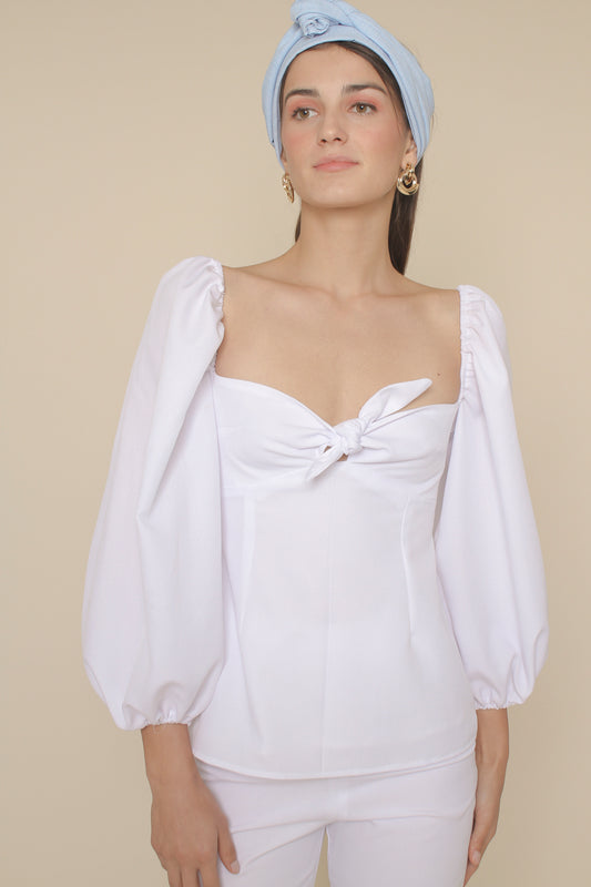 MARI TOP Puff Sleeve Blouse with Tie (White Linen)