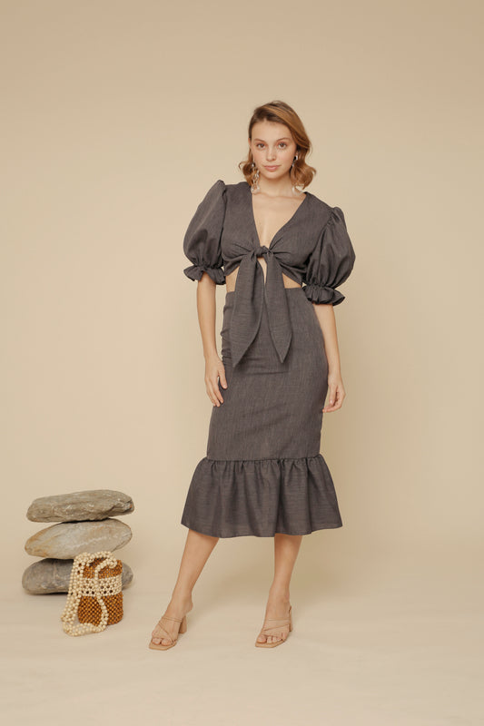 MONTSERRAT SET Puff Sleeve Tie Top and Ruffled Hem Pencil Skirt (Black Chambray)
