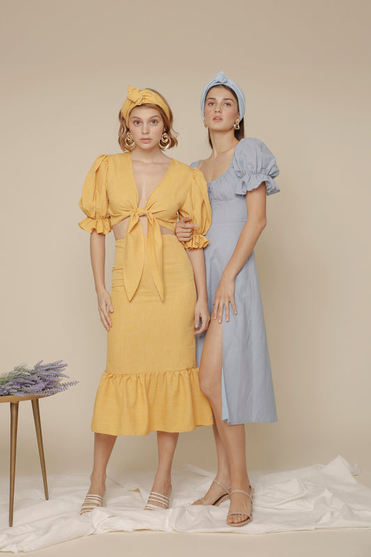 MONTSERRAT SET Puff Sleeve Tie Top and Ruffled Hem Pencil Skirt (Yellow Chambray)