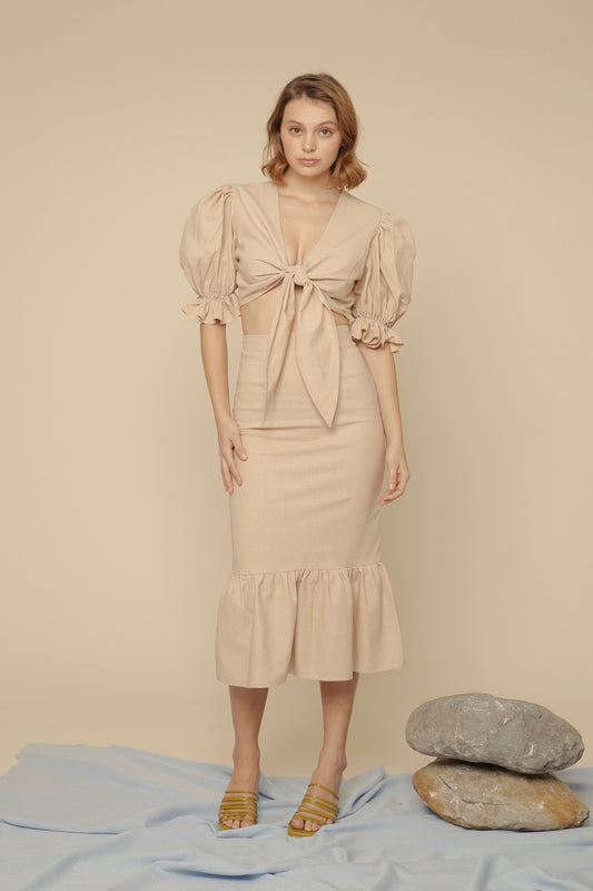 MONTSERRAT SET Puff Sleeve Tie Top and Ruffled Hem Pencil Skirt (Nude Linen)
