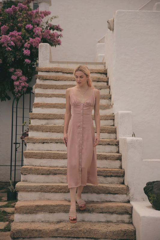 RIVIERA Button Down Slip Dress Gathered Cup Detail (Tan Silk)