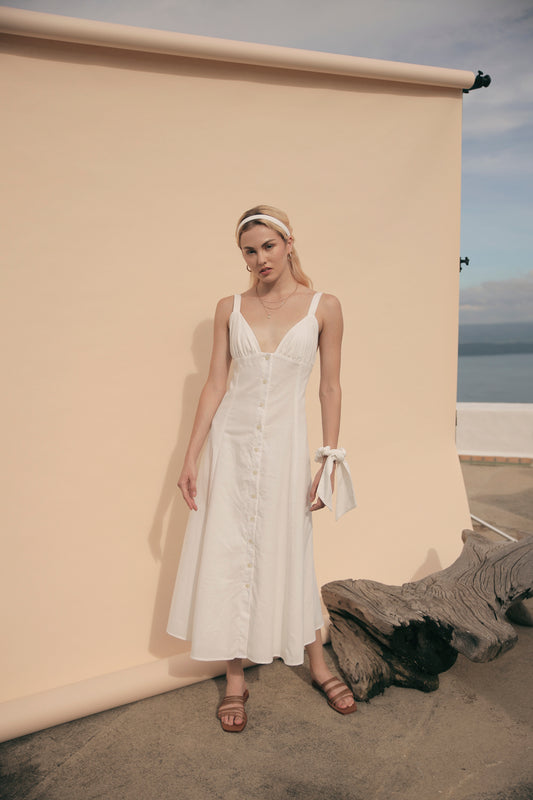 RIVIERA Button Down Slip Dress Gathered Cup Detail with Matching Scrunchie and Mask (White Linen)
