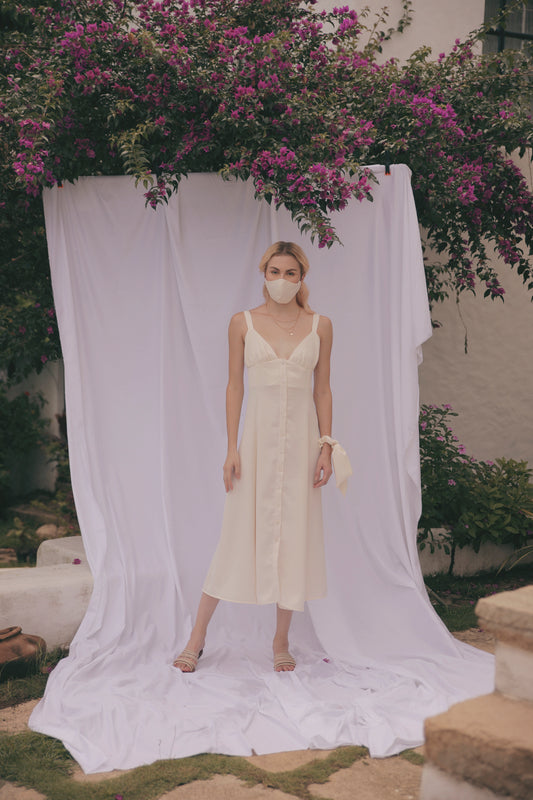 RIVIERA Button Down Slip Dress Gathered Cup Detail (Cream Silk)