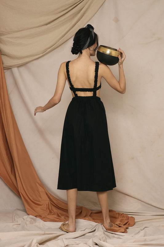 SIERRA Gartered Backless Midi Dress (Black Linen)