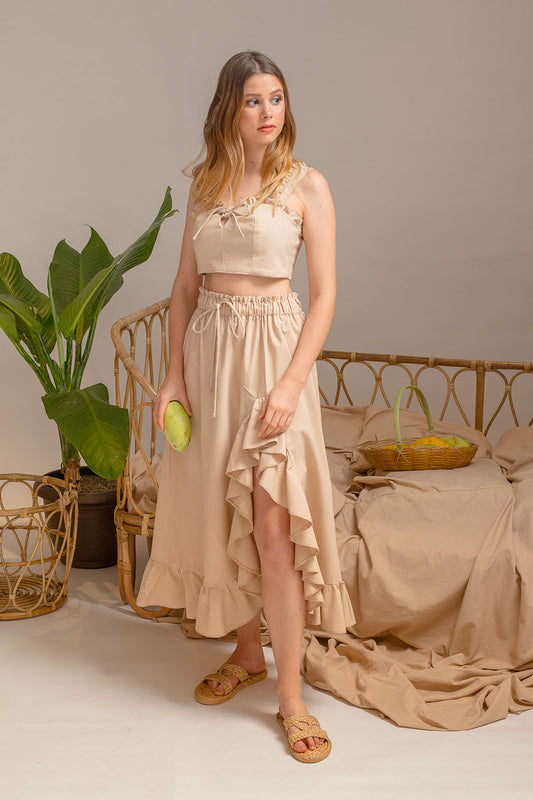 TULUM SET Crop Top with Mini Ruffle Detail and Garterize Ruffled Skirt (Nude Linen)