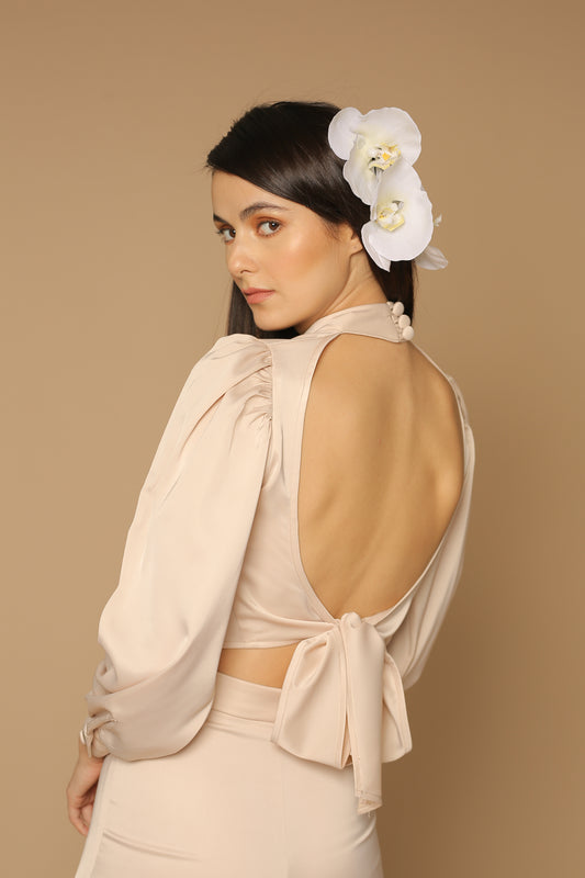 BRISA PANTS SET Puff Sleeve Top with Open Tie Back and Wide Leg Pants (Light Nude Silk)