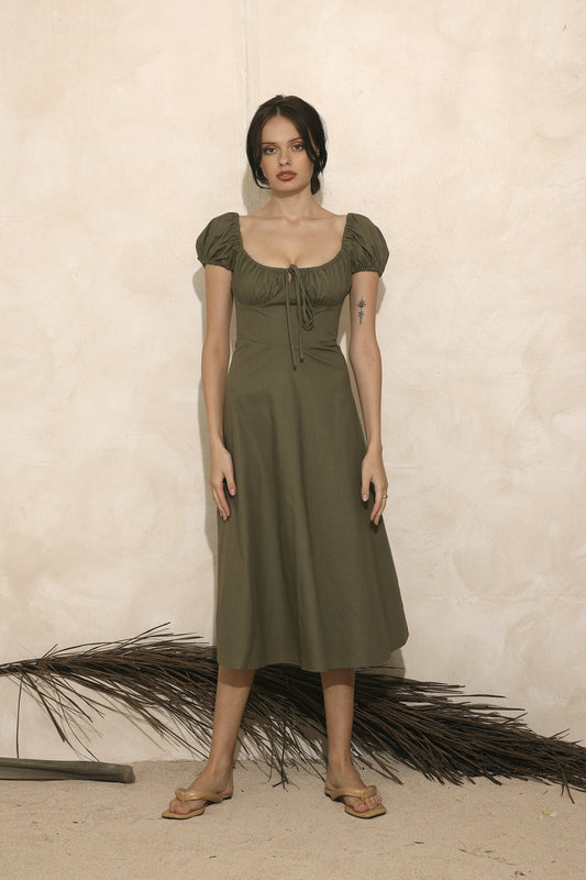 MATHILDE Puffy Sleeve Midi Dress with Gathered Cup (Olive Linen)