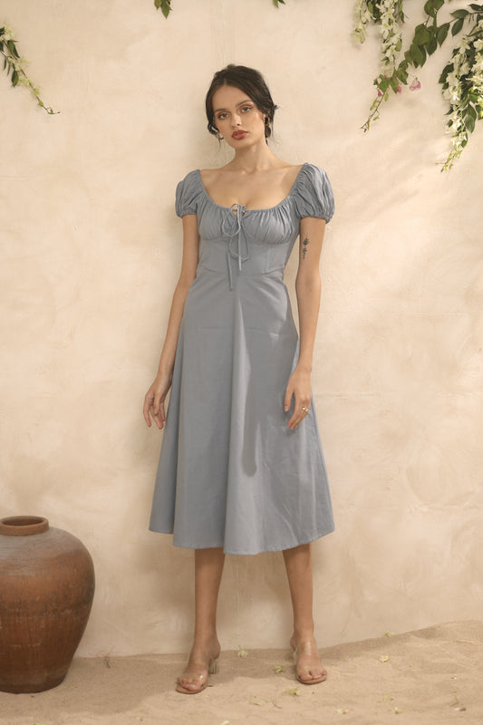 MATHILDE Puffy Sleeve Midi Dress with Gathered Cup (Serenity Blue Linen)