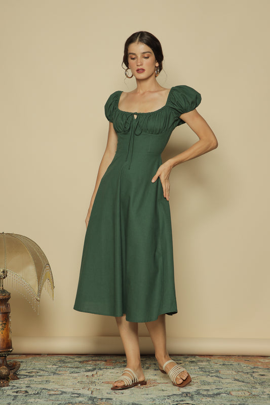MATHILDE Puffy Sleeve Midi Dress with Gathered Cup (Hunter Green Crepe)