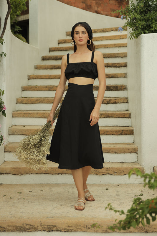 AGNES SET Gathered Crop Top with Midi Skirt (Black Linen)