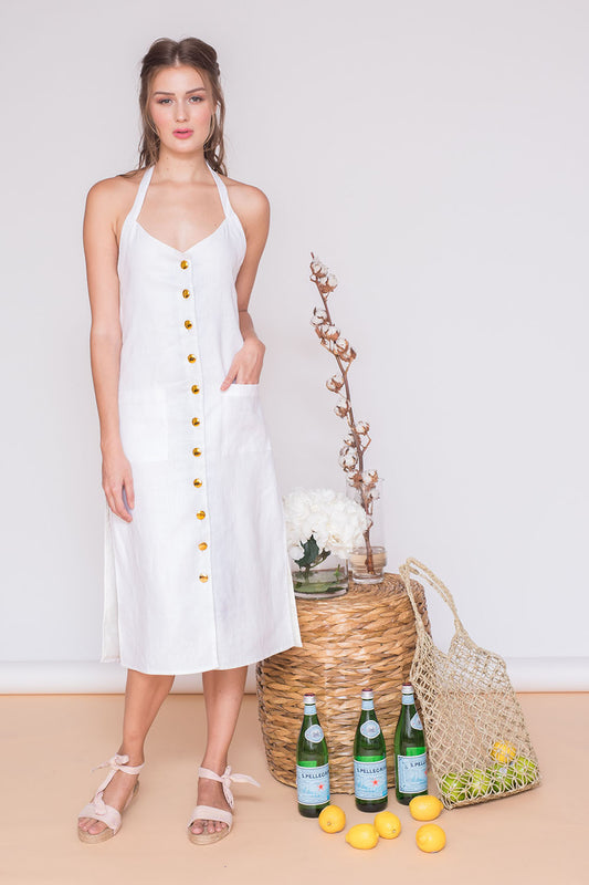GRENADA Halter Midi Dress with Button Detail and Side Slits (White Linen)Regular price ₱2,750.00Regular priceUnit price / per-